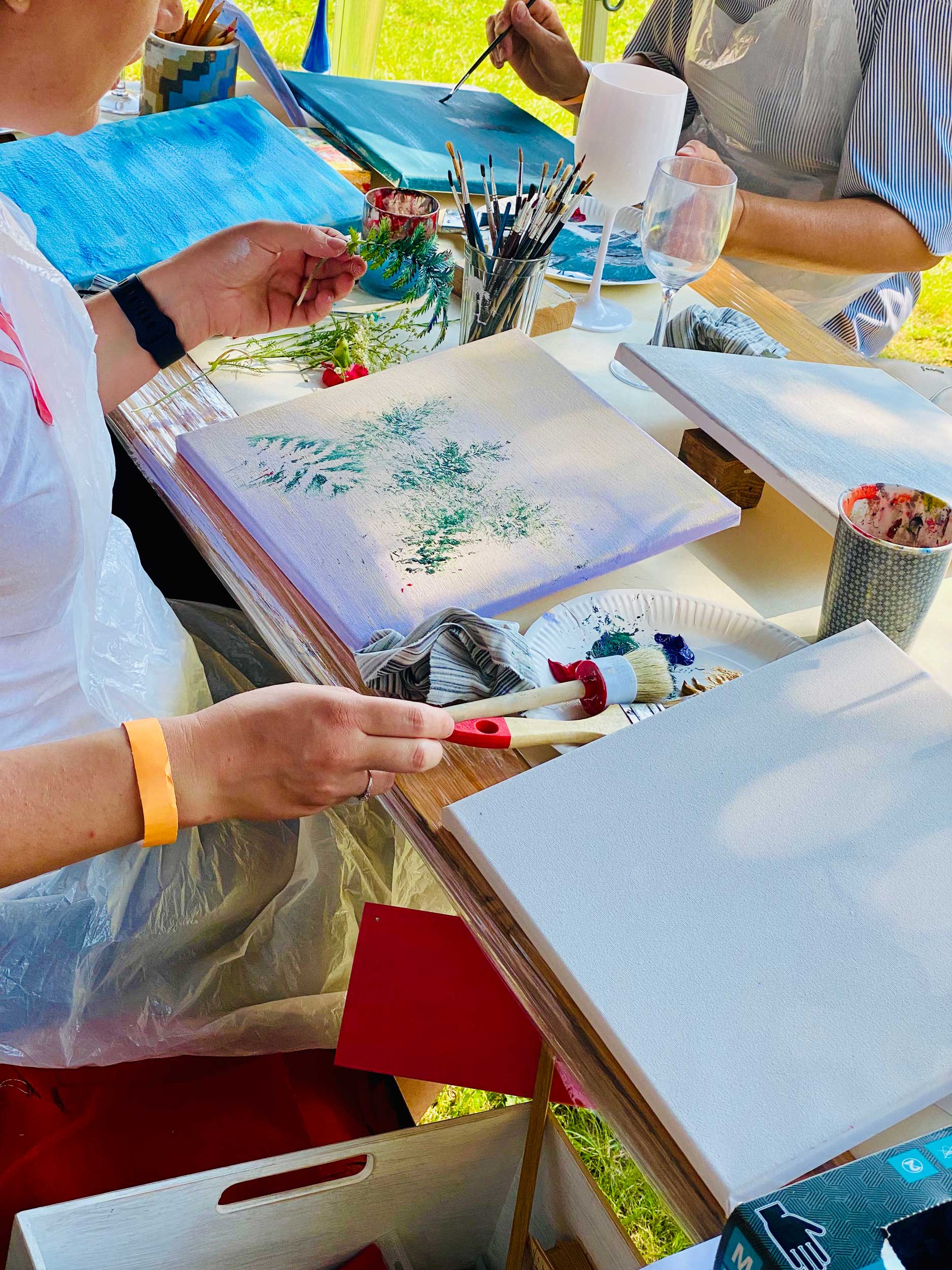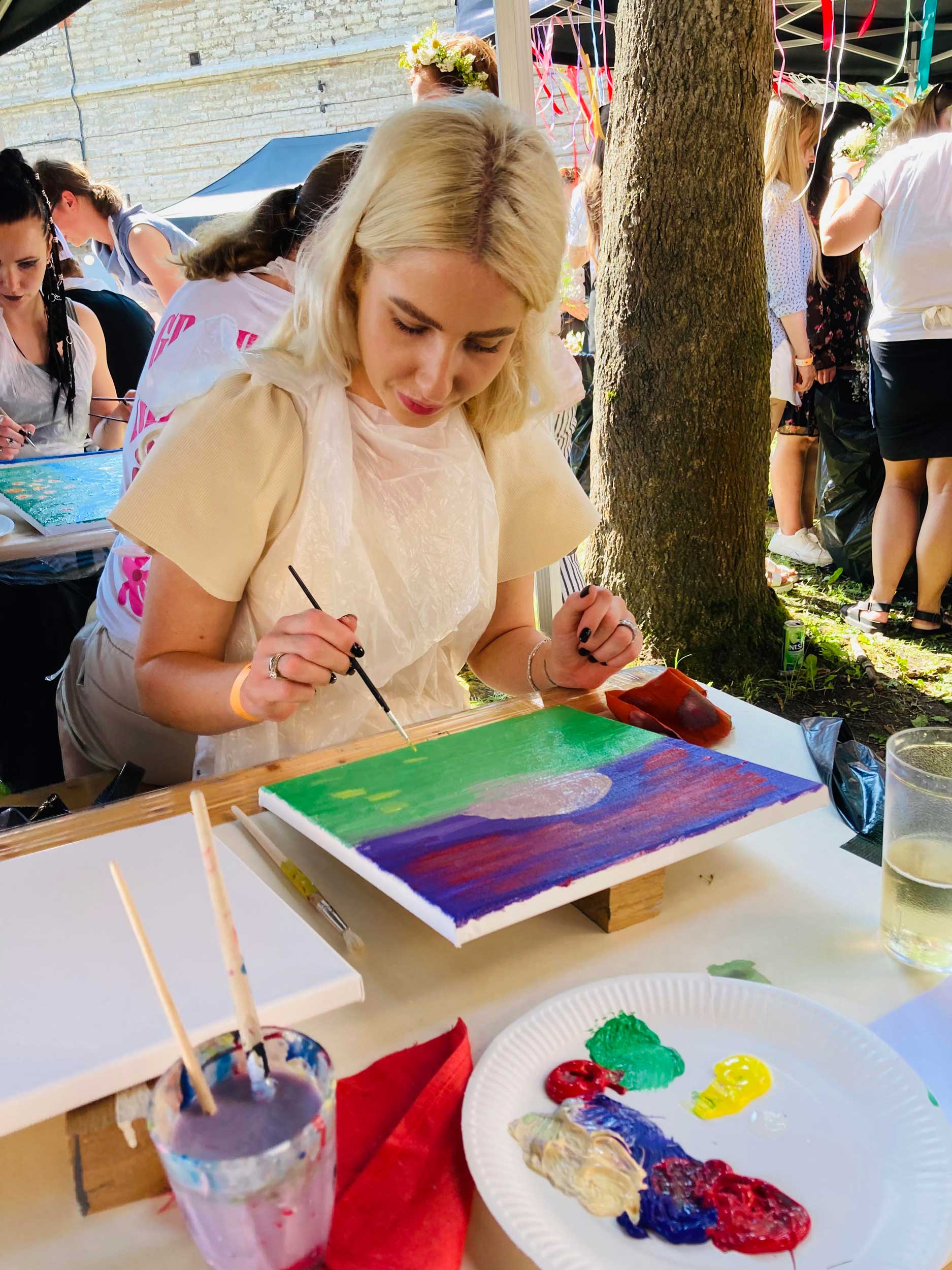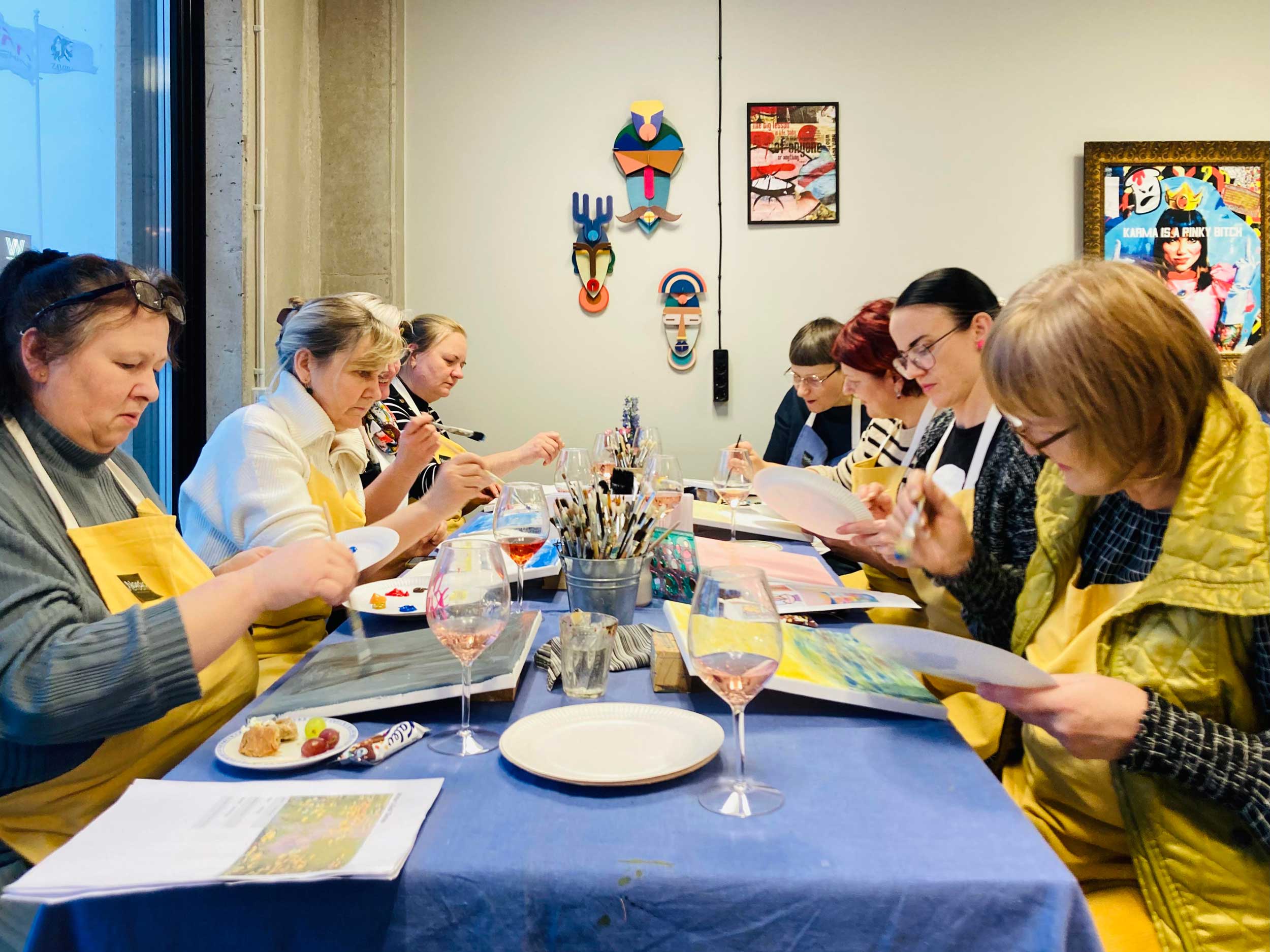 Meie poolt on juhendaja, tehnilised juhtnöörid, krunditud puuvillane lõuend puitraamil, akrüülvärvid, pintslid, lisandid ja kõik muu, mida võib maalimisel vaja minna. Valmis töö saab iga osaleja endaga kohe kaasa.